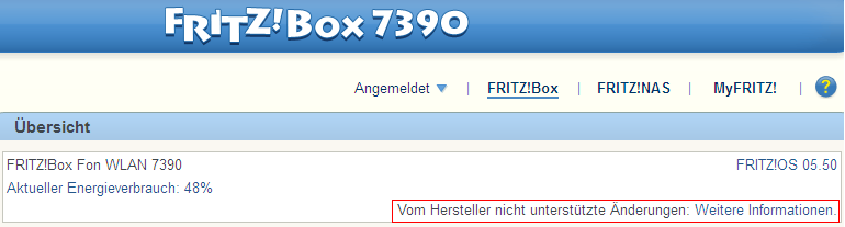 Hinweis: Ab jetzt erscheint auf der Startseite der Fritz!Box der Hinweis auf eine „nicht unterstützte Änderung“.